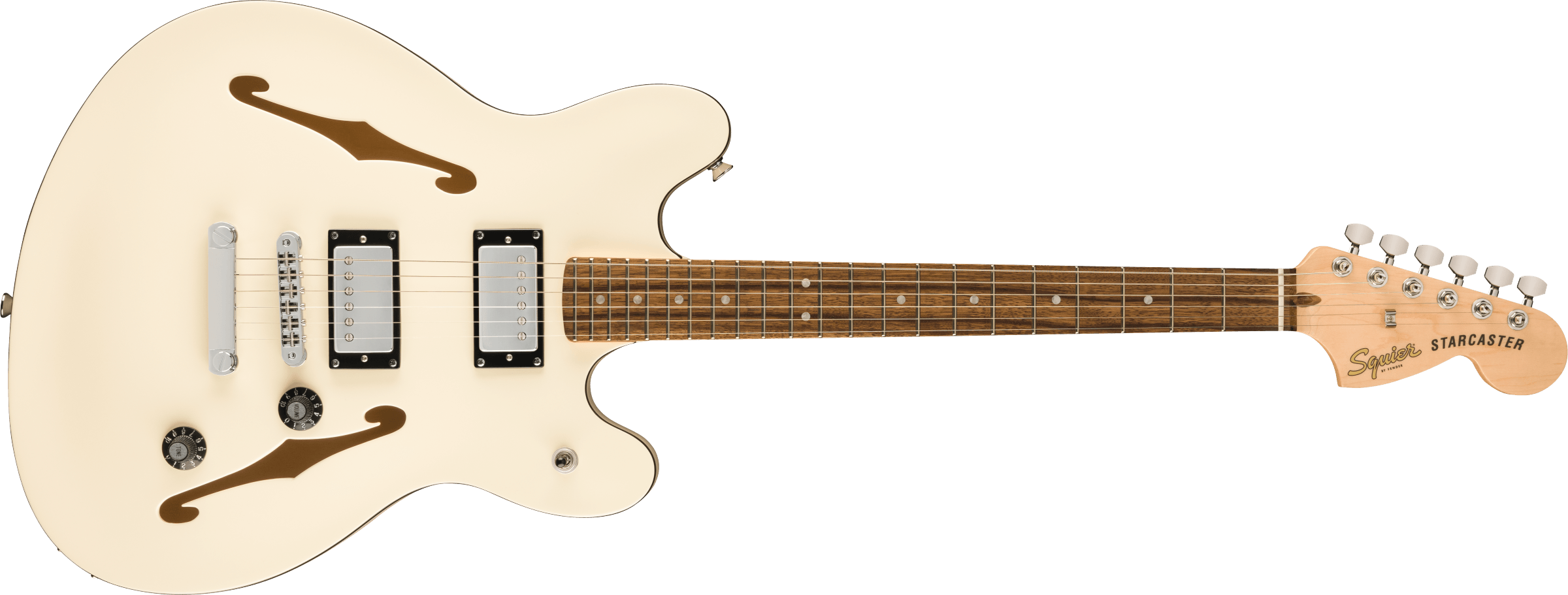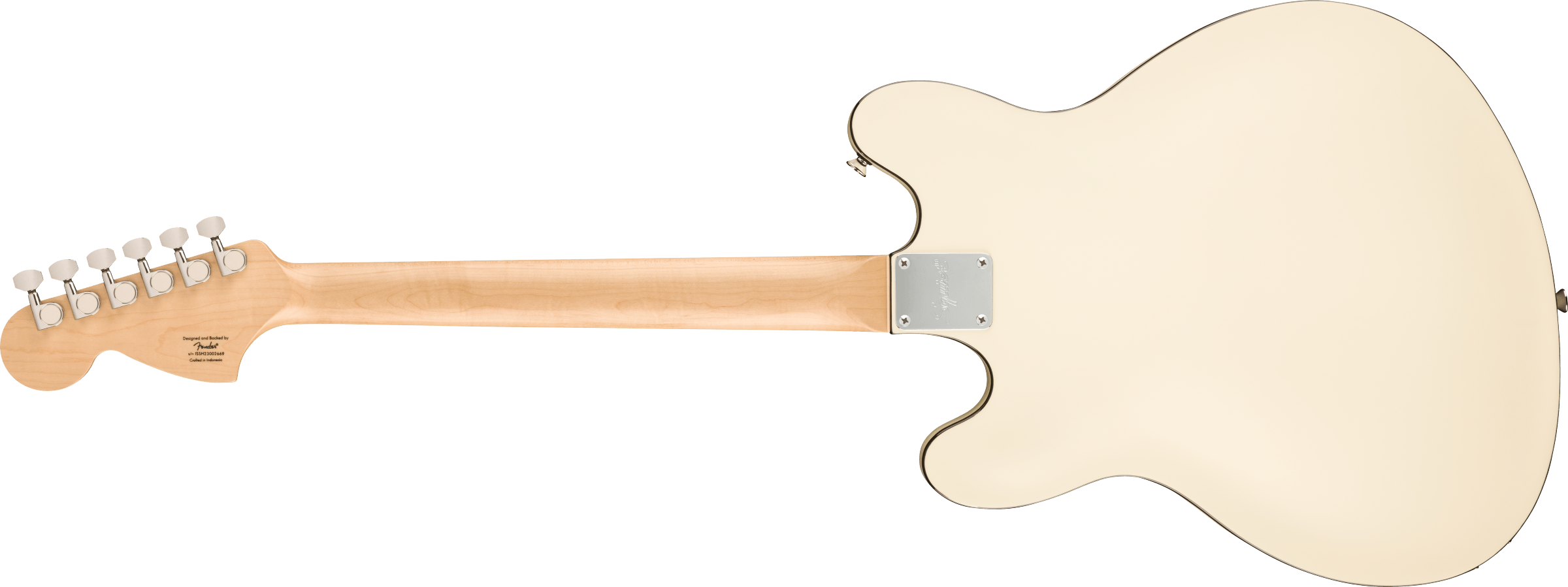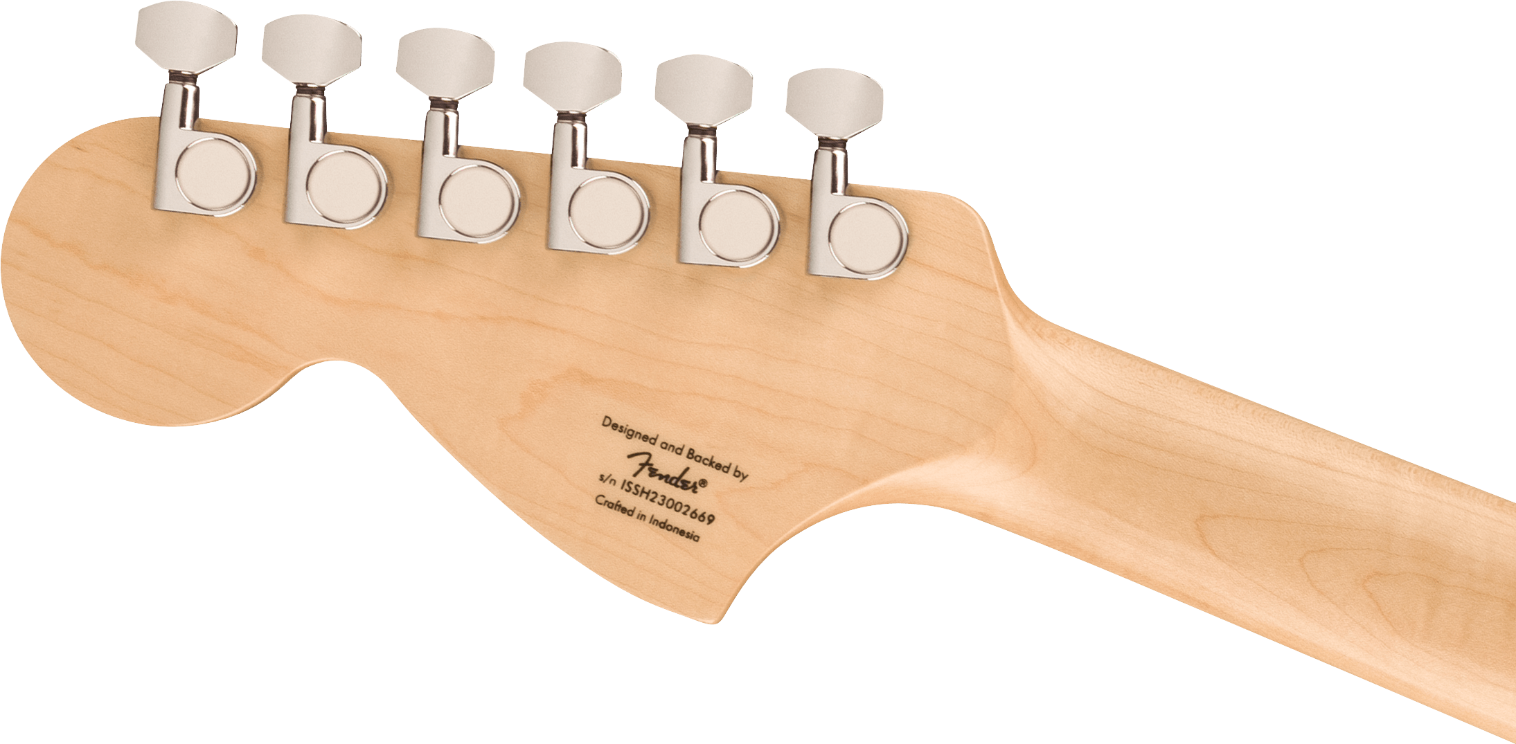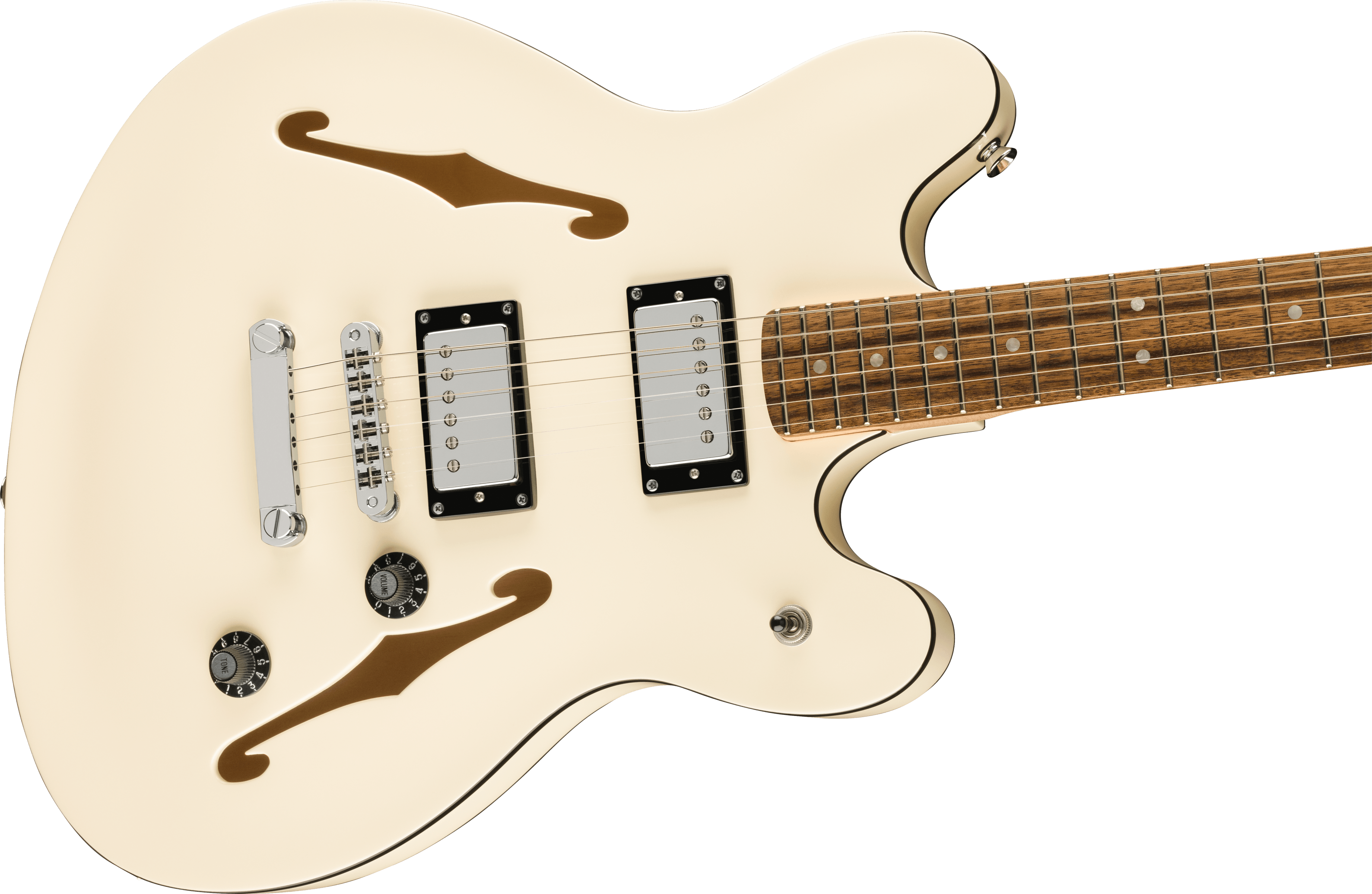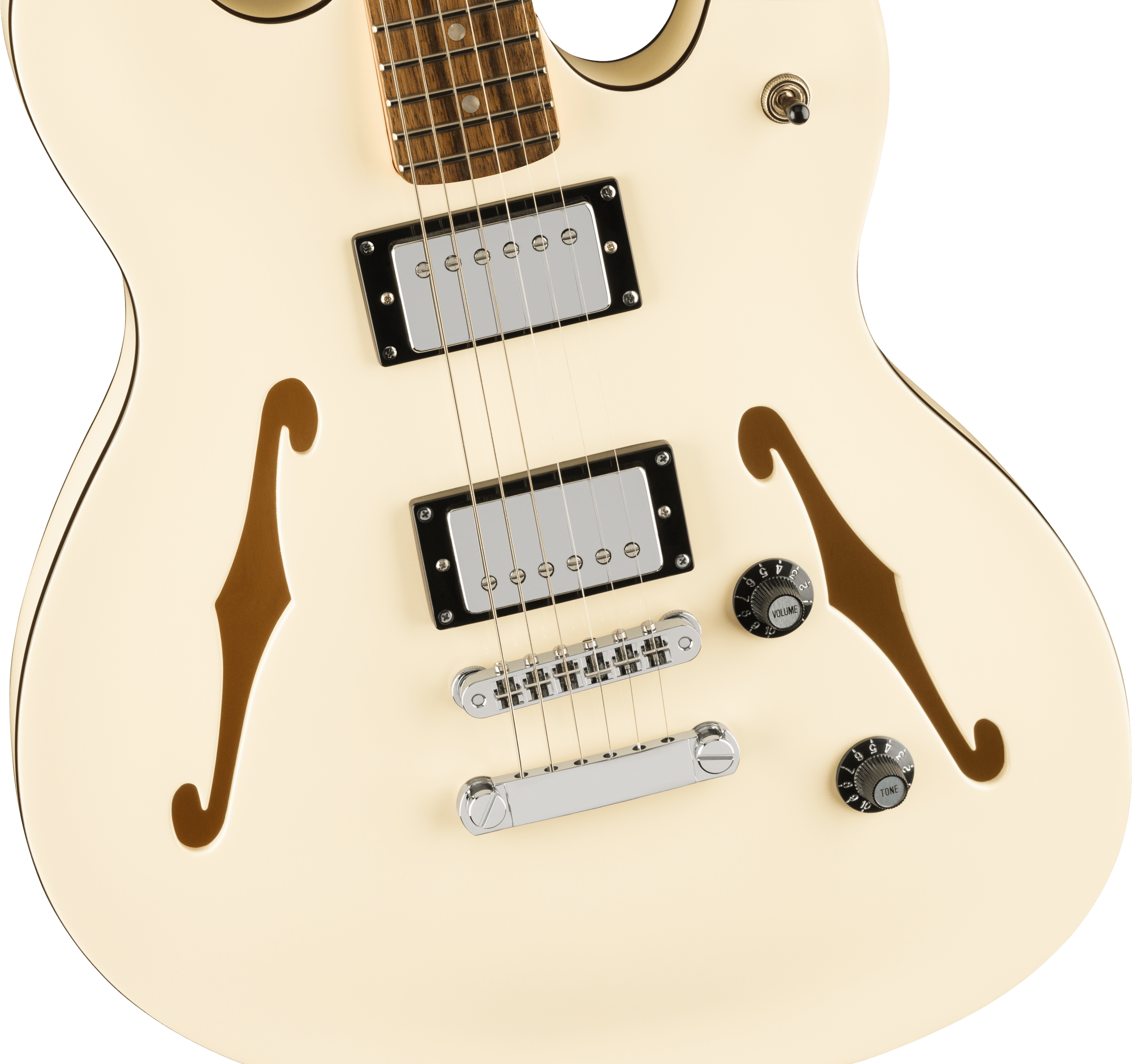 -Cuerpo semi-hueco con diseño desplazado-Puente ajustable con cordal tipo stopbar-Perfil de mástil delgado y cómodo en forma de 'C'-Doble pastilla humbucking Squier-Clavijas de afinación selladas con ejes divididos